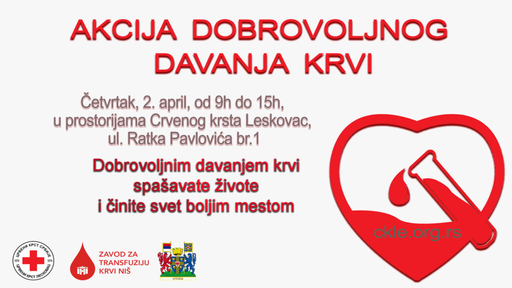Crveni krst Leskovac i Zavod za transfuziju krvi NIš i ove nedelje organizuju redovnu akciju dobrovoljnog davanja krvi. Kao i uvek u redovnim terminima, i ovog četvrtka, 2. aprila, akcija će biti održana u prostorijama Crvenog krsta Leskovac, u „zgradi „Starog ureda“ od 9 do 15h.